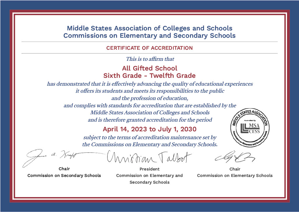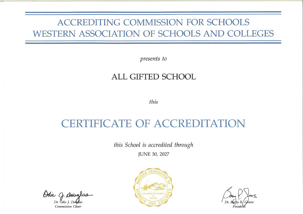 Our ACS WASC and MSA-CESS accreditation is publicly verifiable. Search for ‘All Gifted School’ in either database.
